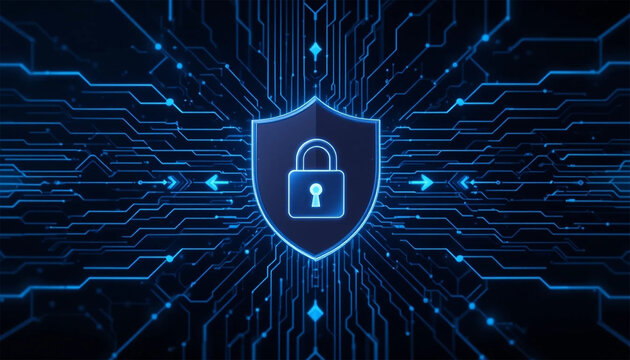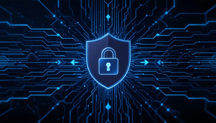 Padlock Icon Inside Shield with Blue Lines and Circuit Background for Cybersecurity