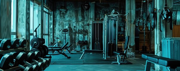Interior view of a modern gym with weight training equipment including racks of dumbbells, cardio machines, instructional posters, and CYBEX equipment in a well organized space.