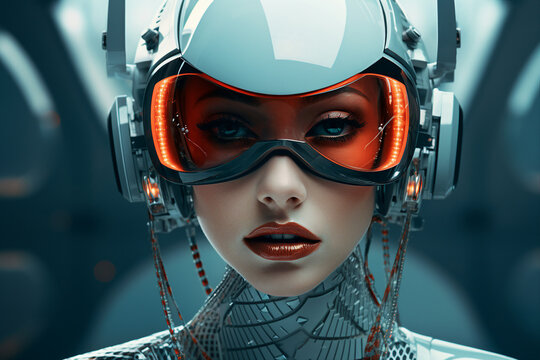 A futuristic female cyborg with human traits and advanced enhancements looks into the distance, her helmet featuring complex digital interfaces and glowing holographic data