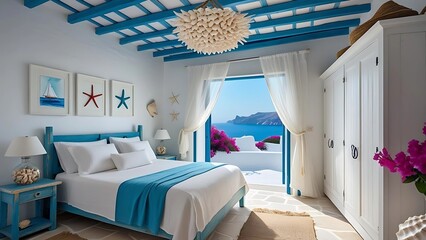 Rustic Mediterranean Bedroom in Cycladic Style with Sea-Themed Artwork