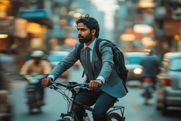 Delighted male entrepreneur smiling and walking on the street carrying a bicycle on sunny day in downtown of modern city