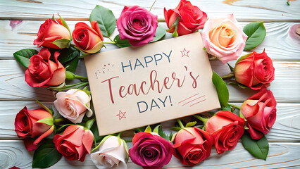 White round banner with pink, yellow, apricot photo realistic roses with hand writing font text Happy Teacher's Day on a light background. Elegant luxury vector design.
