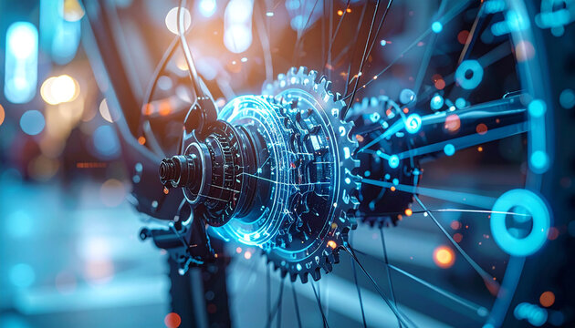 Bicycle Gear Technology: A close-up view of a bicycle gear mechanism, with digital data overlays, illustrating the intricate engineering and technological advancements in cycling.
