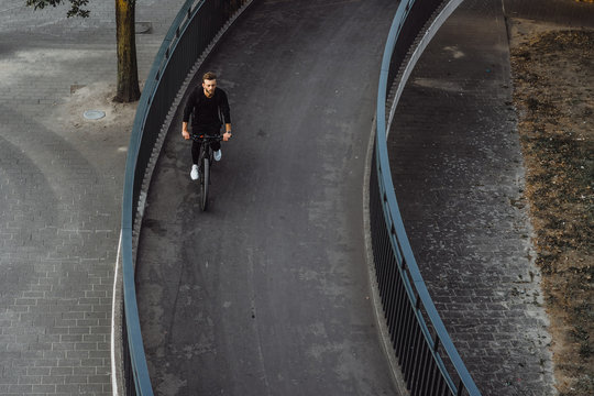 Front view of professional cyclist in sport outfit practising in cycling with blur background of green nature. Concept of summer activity and healthy lifestyle