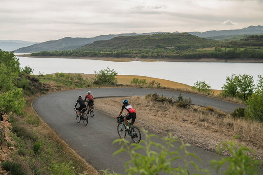 Road cycling photo. Two triathlete train in beautiful nature. Sea and mountains in background. Alcudia, Mallorca, Spain
