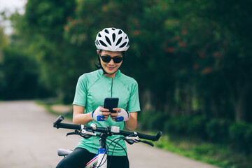 Professional female cyclist analyzing performance with technology