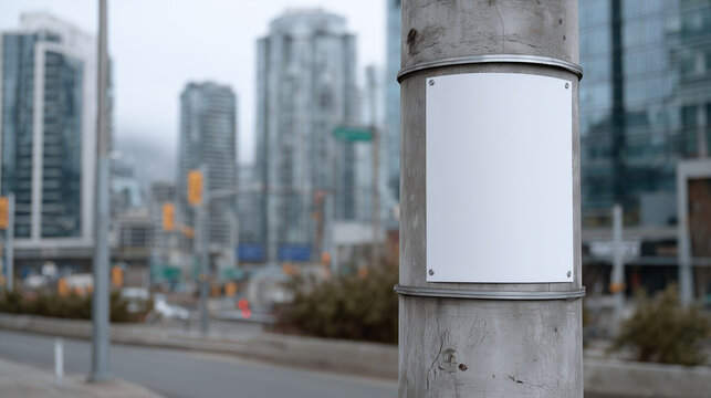 Street-level perspective of cylindrical pole with blank poster, overcast sky, distant skyscrapers slightly hazy, realistic textures on pole and poster edges