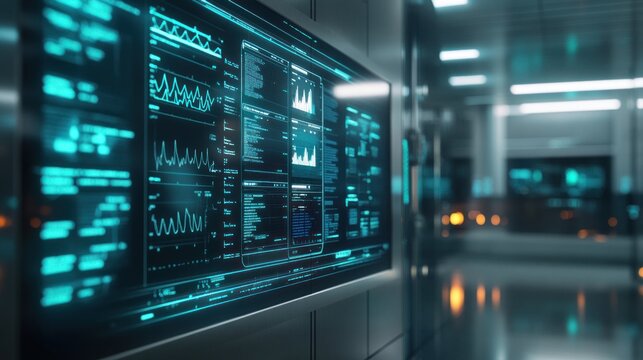 Futuristic financial dashboard displaying analytics with charts and metrics