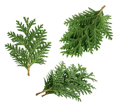 Arborvitae branch, isolated on white background. Green thuja sprig.
