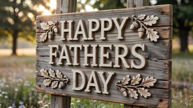 Wooden happy fathers day sign with oak leaf and acorn decorations set in a natural outdoor scene