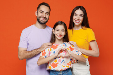 Young smiling parents mom dad with child kid daughter teen girl in basic t-shirts showing shape heart with hands heart-shape sign isolated on yellow background studio. Family day parenthood concept