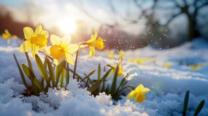 Spring flowers. Close up of narcissus flowers blooming in a garden. Daffodils