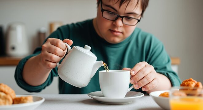 Young man with down syndrome wearing glasses pouring tea from teapot into cup at home. Person with special needs enjoying hot beverage in kitchen. Inclusion, independent living. Home care service sale