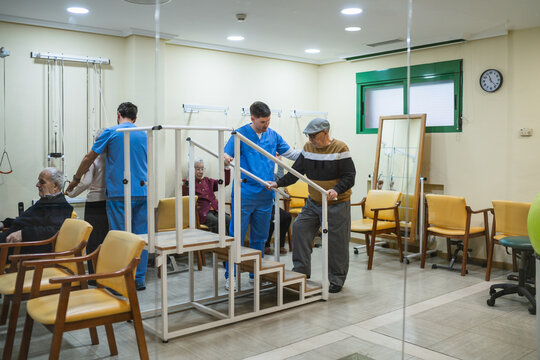 Elderly man receiving rehabilitation in a nursing home, carefully stepping up a ramp with nurse support and supervision