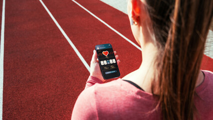 Health app. Smart phone screen with fitness health or sport gym mobile application. Woman holding home online workout app.