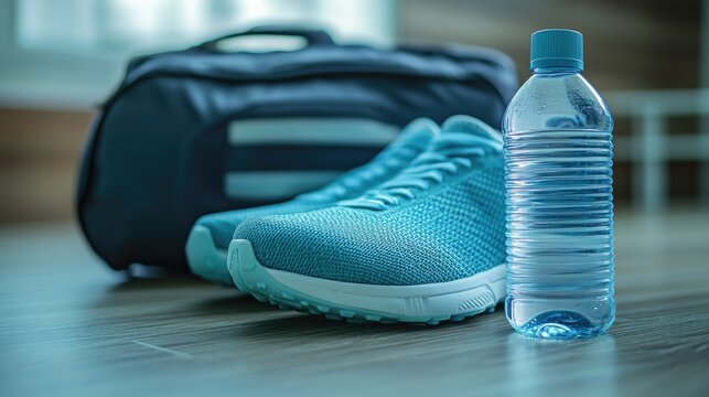 Sporty items including football sneakers, a water bottle, and a running bag are arranged on a table against a light background