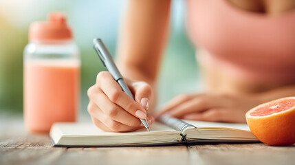 A woman journaling after her workout, reflecting mindfulness, self-tracking, and fitness goal setting in daily wellness routines.