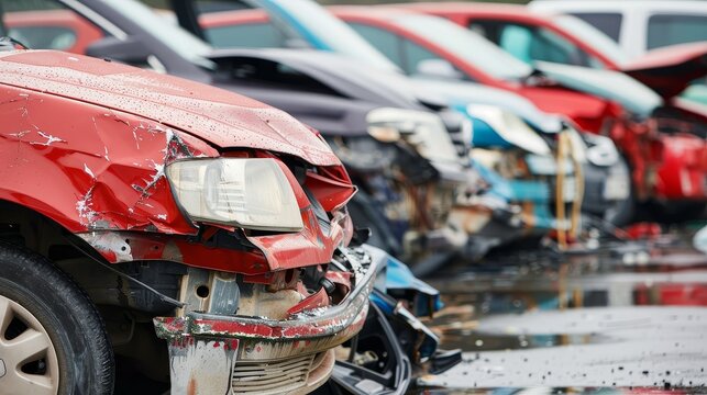 Row of damaged cars with varied levels of destruction.