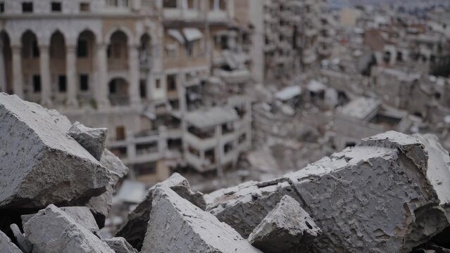 Ruins of buildings, concrete debris, damaged architecture, urban destruction, architectural remnants, cityscape.