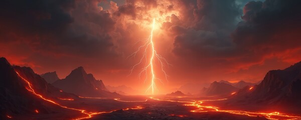 Hellish landscape with glowing lava rivers under a stormy, lightning-filled red sky. Jagged mountains rise around a desolate, fiery plain. This is end times imagery.