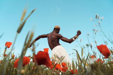 Dynamic portrait of shirtless male dancer posing with arms extended head tilted back against white studio background. Concept of human motions, wellness, natural beauty of male body.