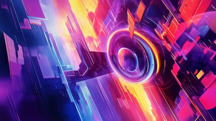 Neon geometric patterns swirl into a digital art portal, forming a vibrant dance of shapes and vivid techno-futuristic hues.