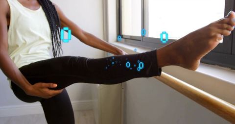 Blonde woman stretching at barre with augmented data analytics overlay for dance fitness