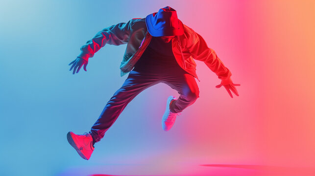 guy acrobat doing back fat in new lighting, male dancer jumps and falls in the air on red blue background