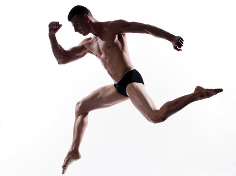 Handsome caucasian male ballet dancer performing pirouette and spinning on stage, wearing white tights, spotted by searchlight and isolated on black background