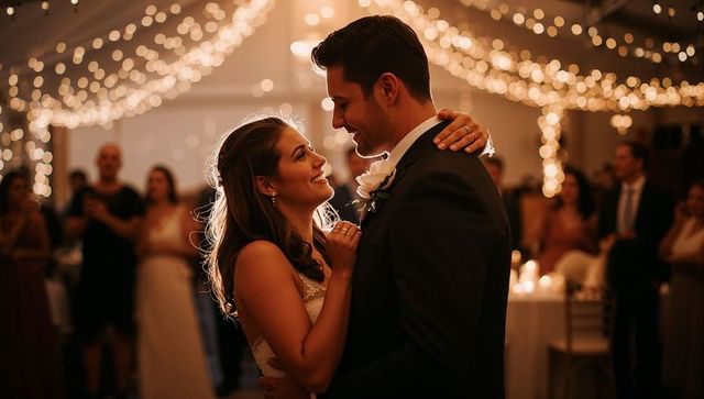 Newlyweds dancing romantic first dance under twinkling string lights in elegant reception