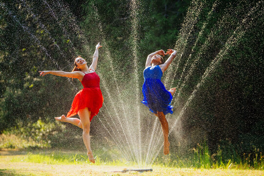 Two women in colorful dresses dancing joyfully among sprinkler water droplets in sunlit outdoor setting.