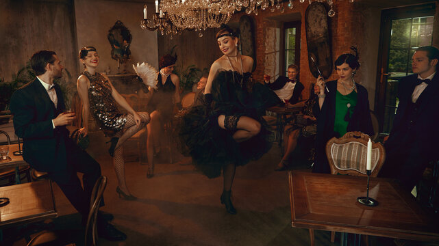 People men and women friends dancing joyfully in cowboy attire outdoors