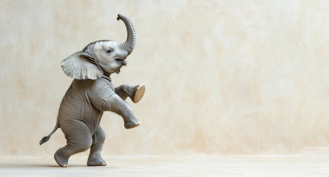 A baby elephant joyfully dancing on a light beige background, captured mid-motion. This whimsical image symbolizes playfulness, creativity, and imaginative storytelling.