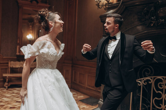 Couple dancing joyfully in formal attire at a private event in an elegant indoor setting