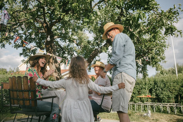 Parents, Children and Multicultural Friends Dancing Together at a Garden Party Disco Event at Home. Young and Senior People Relaxing, Having Fun on a Summer Afternoon.