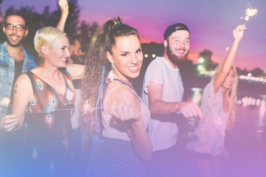 Diverse friends dancing at summer garden party extravaganza