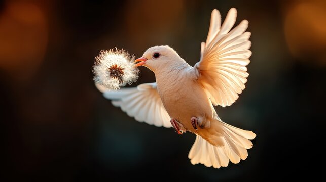 An enchanting bird gracefully soars while carrying a dandelion, embodying freedom and beauty in nature, captured in soft light that highlights its delicate features.