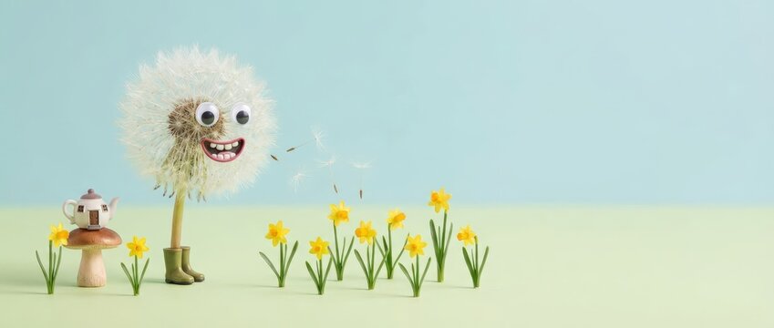 A close-up of a dandelion alongside pink flowers, the delicate timing of the seeds dispersing captures the beauty of nature and the cycle of life against a vibrant sky.