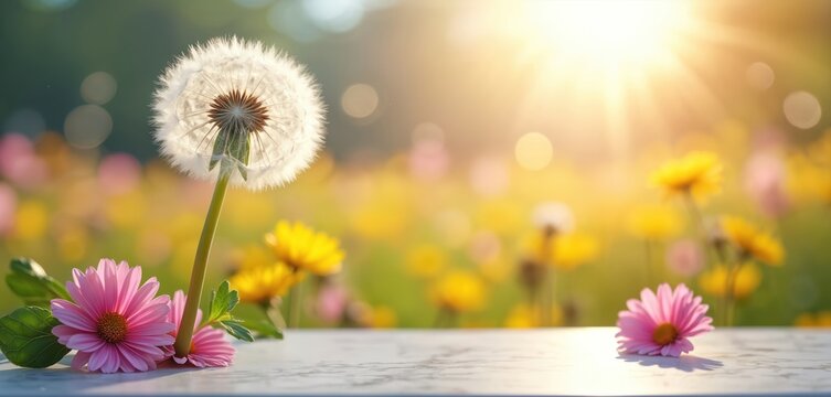 Springtime meadow scene with pink daisies, dandelion clock in soft sunlight. Yellow wildflowers bloom in blurred background, creating delicate pastel bokeh effect. Marble tabletop provides copy space