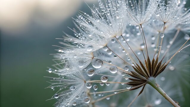Delicate dandelion seeds against a teal background.  Close-up view of fluffy seed heads