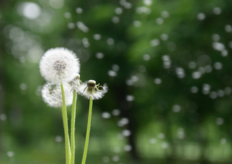 a beautiful close-up of a dandelion at the moment when the seeds fly from it on the background of a green meadow in the morning sunlight