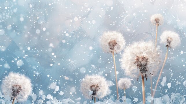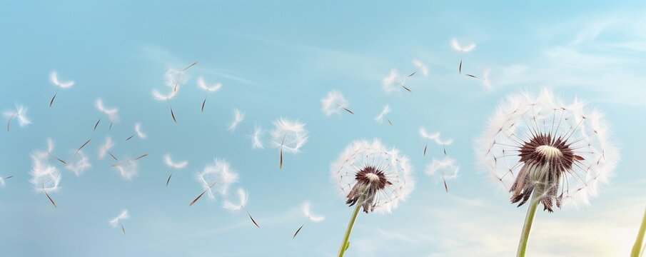 Floral banner with dandelions and fluff on blue sky background, copy space