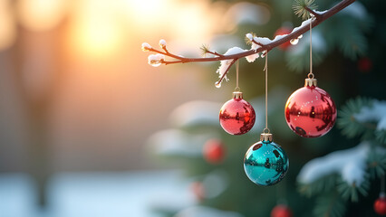 Vibrant blue and purple christmas ornaments dangle against a festive background announcing a big holiday sale