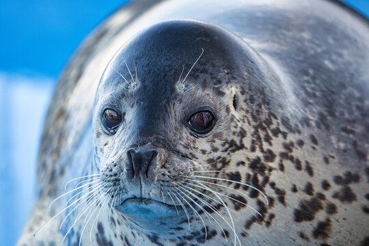 Hokkaido, Japan - November 16, 2023: Closeup of a Face of Spotted Seal