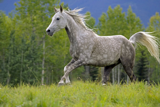 A young grey dapple horse gracefully walking through a vibrant autumn meadow, surrounded by golden leaves, with a soft, warm sunset illuminating the scene.