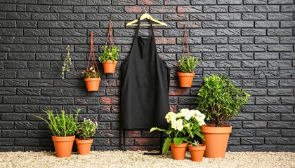 Dark green canvas apron on white wall in the kitchen, apron mockup. Apron for gardeners and gardening.