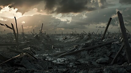 Trench war battlefield area zone damage destroy mud rain wet water dark tone atmospheric.