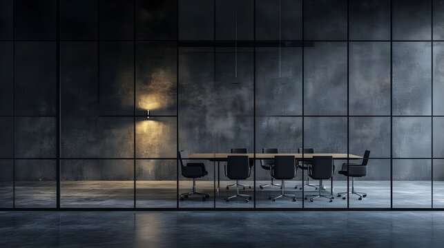 Conference room with an empty table and chairs, enclosed by dark cement walls and transparent glass panels for visibility.