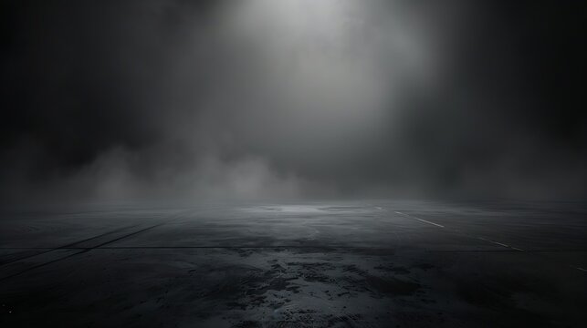 Abstract image of dark room concrete floor. Black room or stage background for product placement.Panoramic view of the abstract fog. White cloudiness, mist or smog moves on black background.