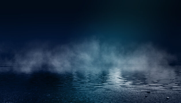 Dark dramatic background. Wet asphalt, smoke and fog. Neon light spotlight. 3d illustration